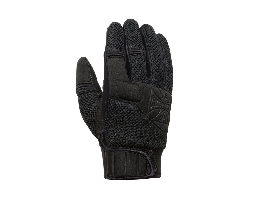Rukavice West Coast Choppers v černé barvě. Na dlani je protiskluzový detail. Plyšová manžeta se zapínáním na suchý zip. Ukazováček vhodný pro dotykové mobilní telefony.