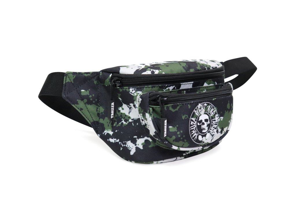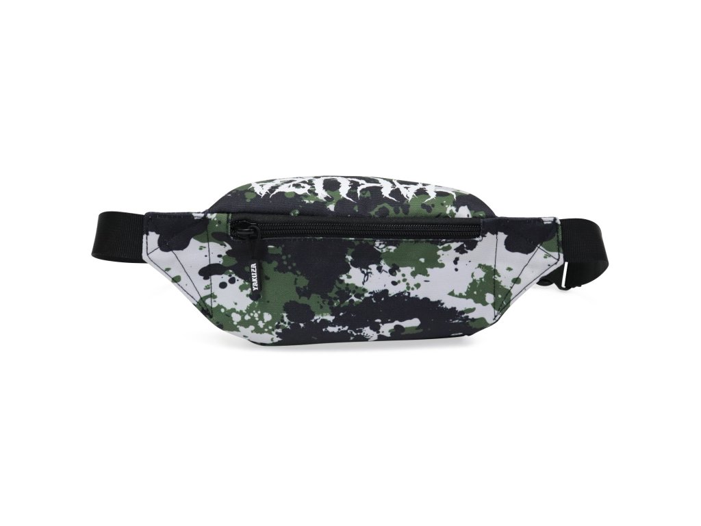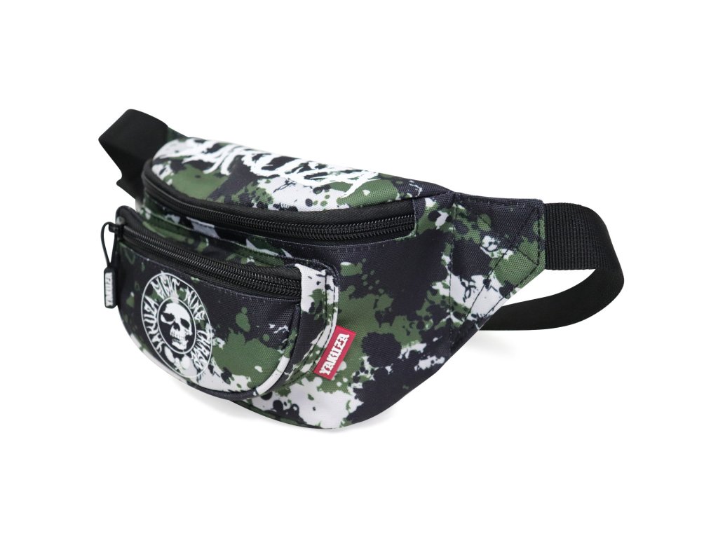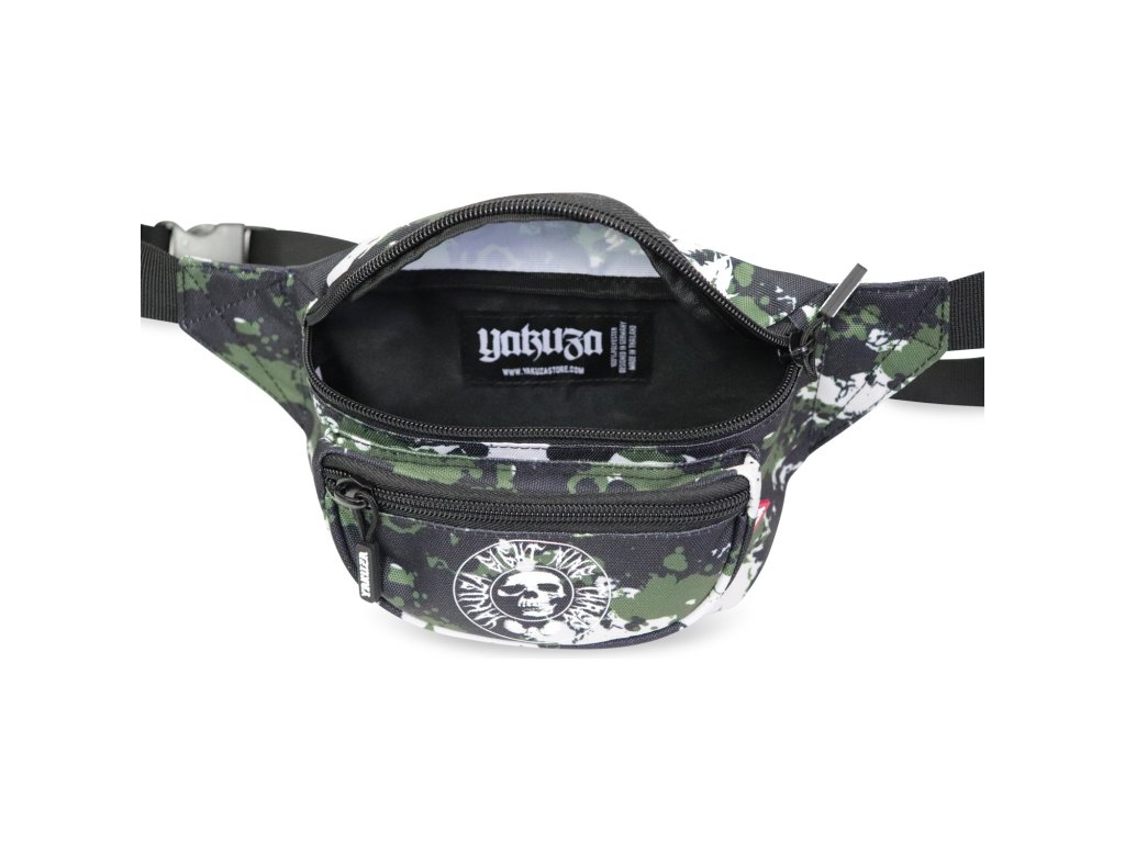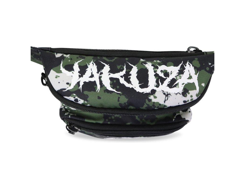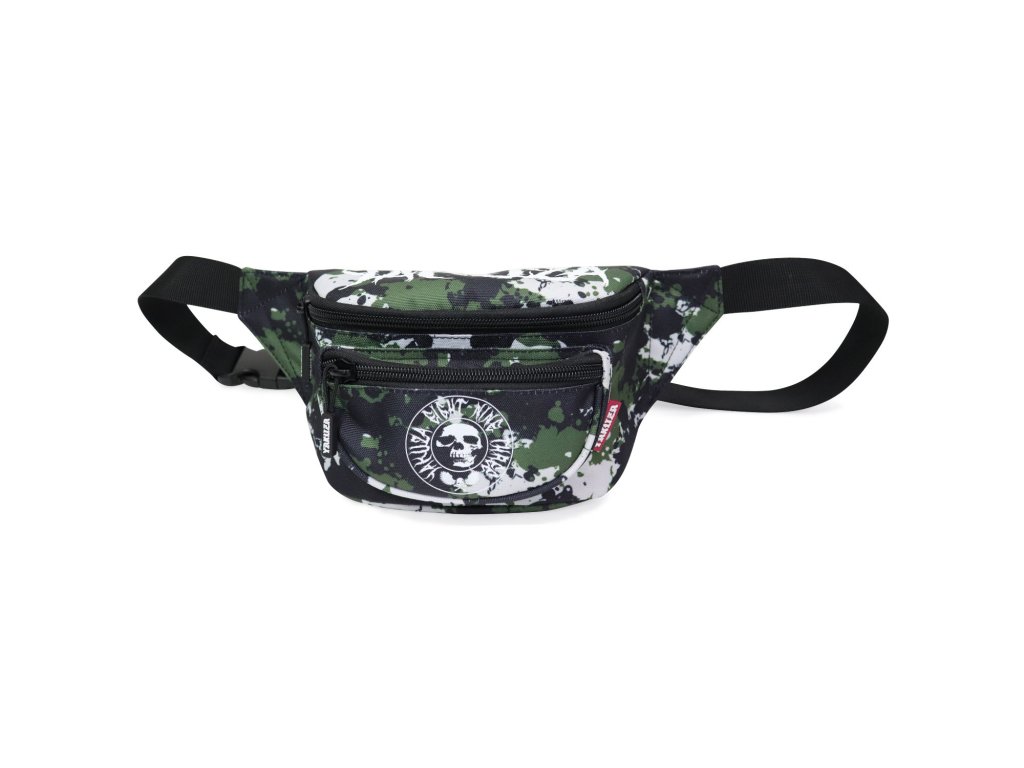 Ledvinka Yakuza Metal Skull 22103 v klasickém kamufláž vzoru. Bílý potisk YAKUZA a kulaté logo, nastavitelný bederní/břišní popruh, tři uzavíratelné přihrádky na zip.