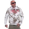 Pánská mikina Yakuza Circus 23014 s dlouhým rukávem a kapucí. Bílá mikina s celoplošným potiskem na těle i na rukávech, šňůrkou na stahování kapuce a samozřejmostí je štítek s logem Yakuza na bočním švu.