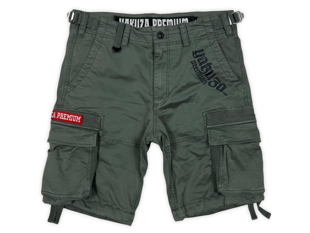 Kraťasy 3655 v šedo-olivové barvě od Yakuza Premium Selection. Kraťasy mají nášivku Yakuza Premium na levé straně a boční kapsy na zip.