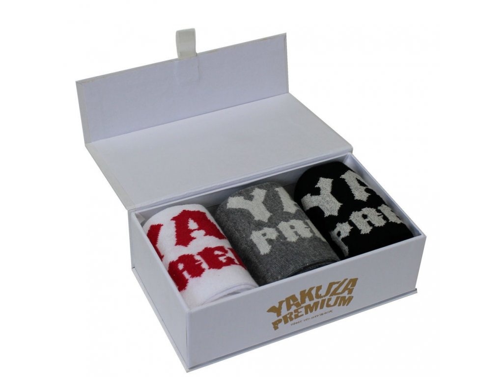 Sada 3 párů ponožek Yakuza Premium (1x bílo-červené, 1x šedo-bílé, 1x černobílé) v dárkové krabičče.