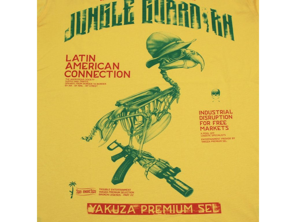 Triko Yakuza Premium Selection 3400 ve žluté barvě. Toto tričko z kolekce jaro/léto 2023 má na přední straně velký potisk zobrazující supa se samopalem. Na zadní straně je v horní části nápis. Měkká bavlněná směs vám poskytne skvělé pohodlí. Vzhledem k přiléhavému střihu je tričko o něco těsnější. V případě pochyb objednejte o číslo větší. Velikost na příkladu XL pas / hrudník a záda cca 52 / 53 a 72 cm měřeno vleže.