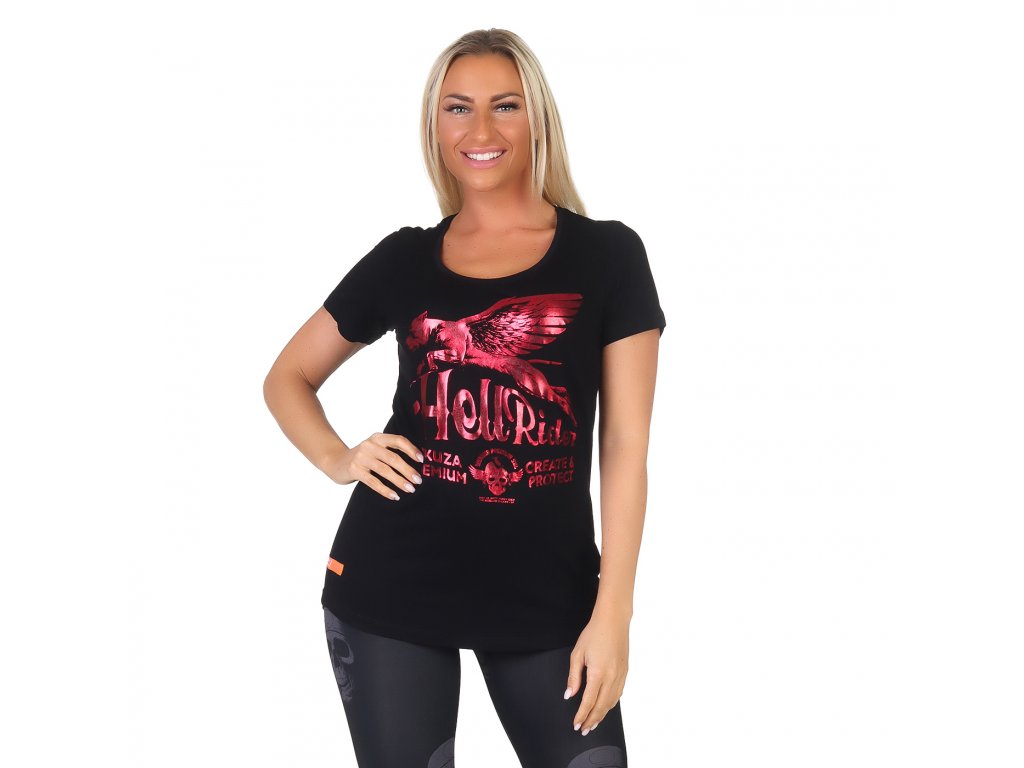 Dámské tričko Yakuza Premium Selection 3536 v černé barvě z kolekce podzim/zima 2023. Toto tričko má na přední straně červený potisk létajícího pitbulla. Měkká bavlněná směs pro skvělé pohodlí.