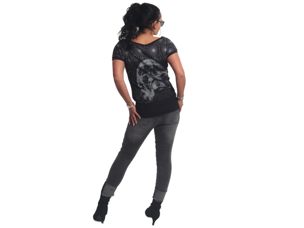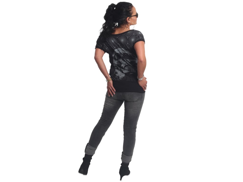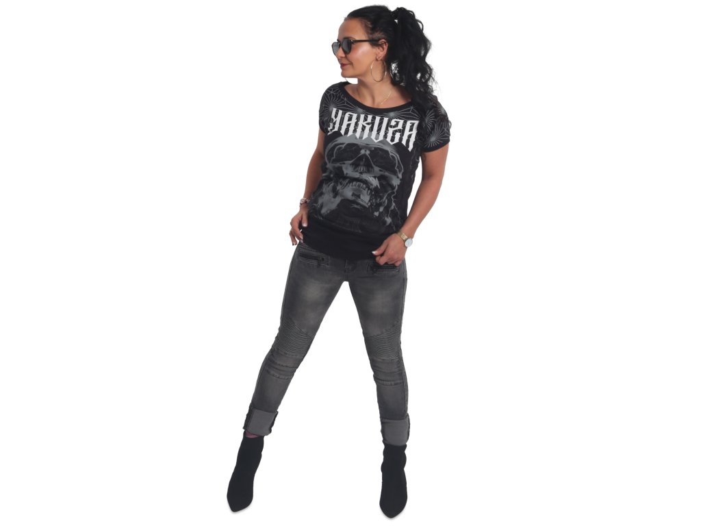 Dámské triko Yakuza Galvanic Wide Crew Neck 21136 s krátkým rukávem. Černé dámské triko s potiskem na přední i zadní straně má zúžený vysoký lem kolem pasu.