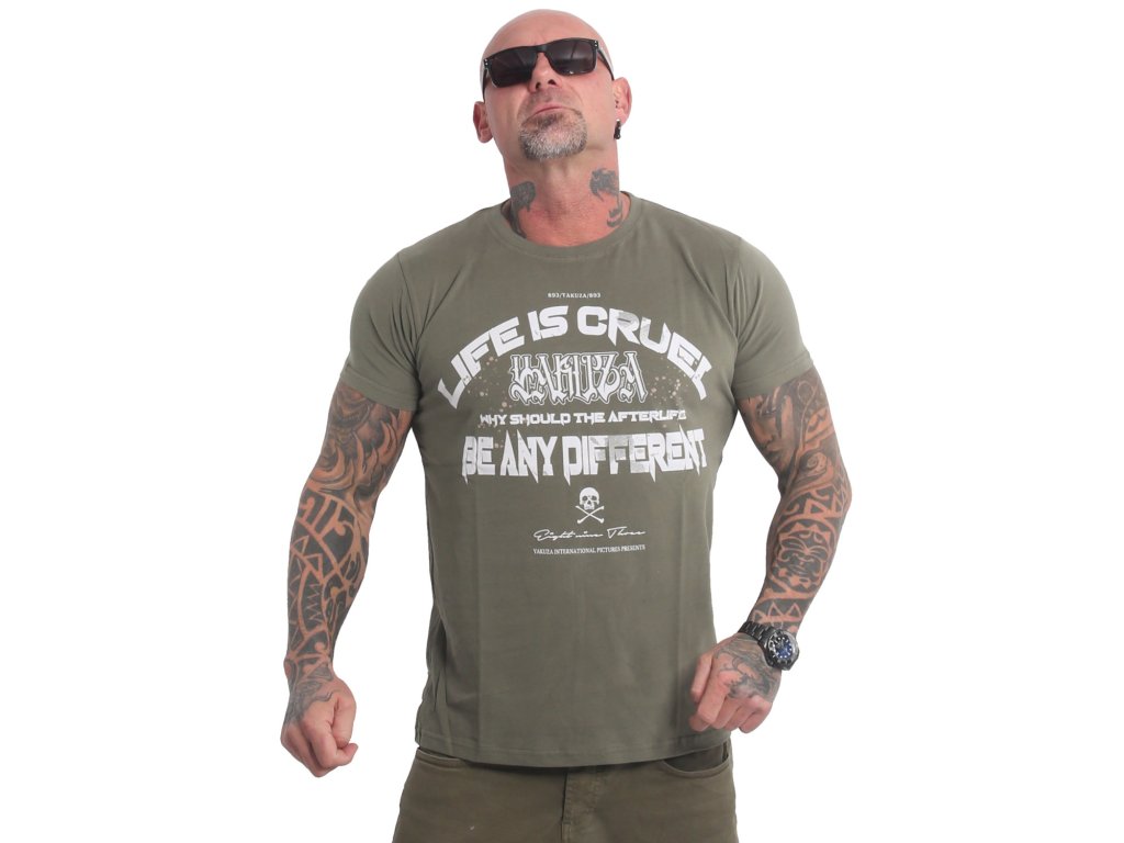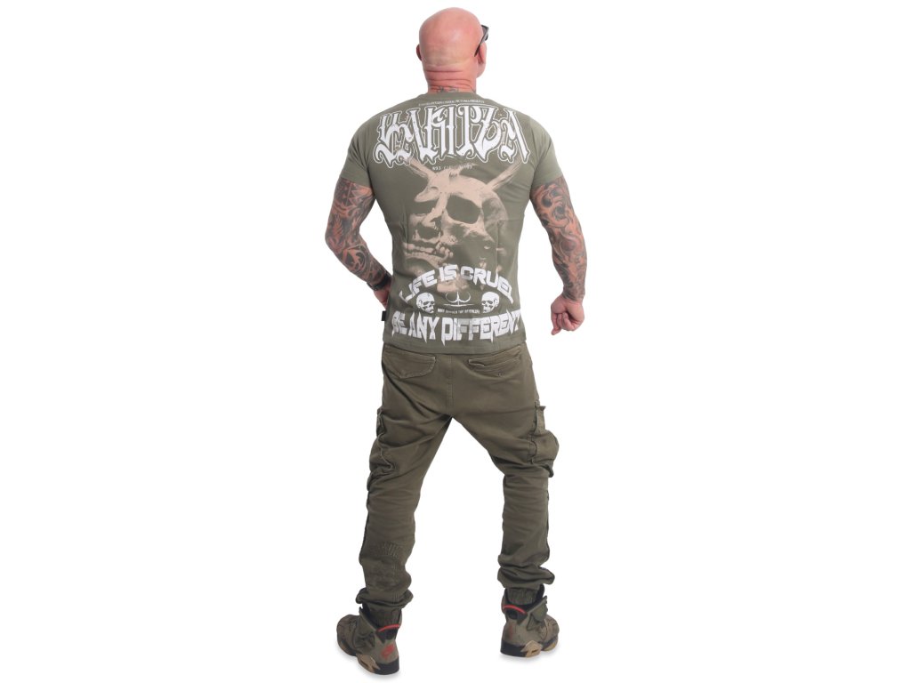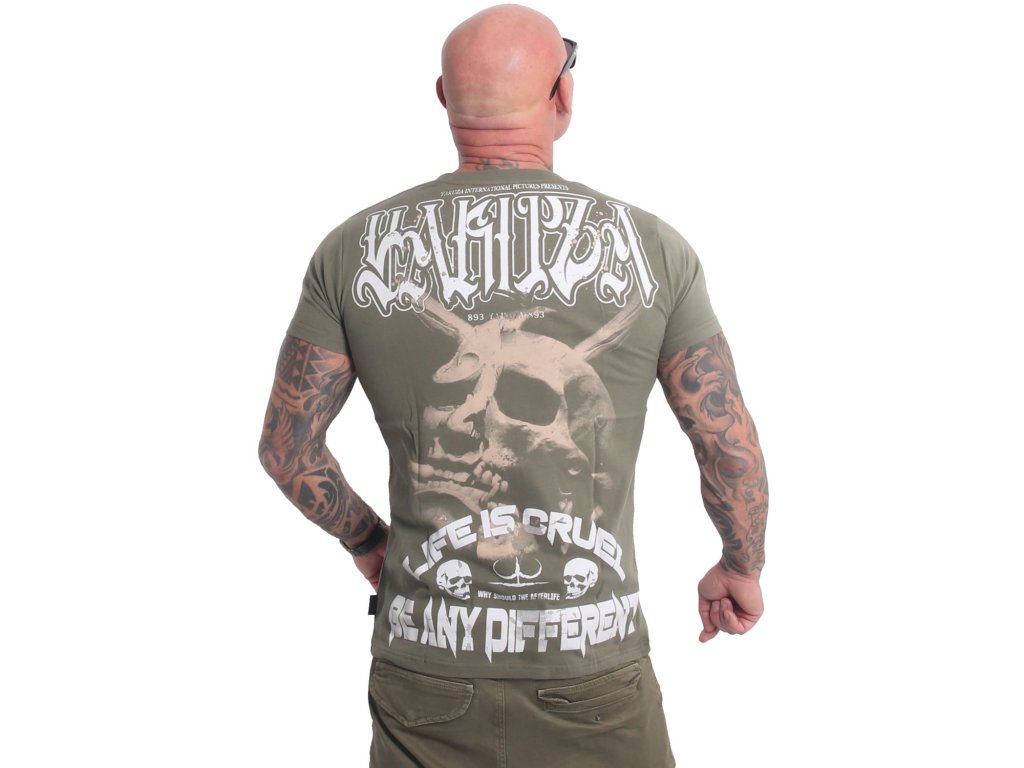 Pánské triko s krátkým rukávem Yakuza Cruel 22007. Olivové triko s kulatým výstřihem a potiskem na zadní straně, samozřejmostí je štítek s logem Yakuza na bočním švu.
