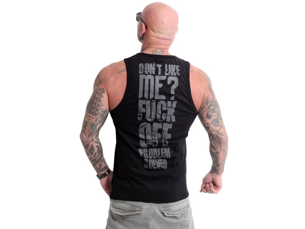 Pánské tílko Yakuza Solved 22024 slim fit navržené tak, aby kopírovalo tvar těla. Tento černý top bez rukávů s kulatým výstřihem má oboustranný potisk a samozřejmě štítek s logem Yakuza na bočním švu.