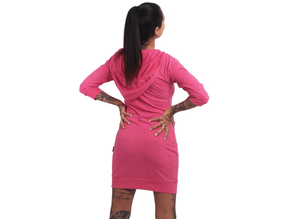 Prodloužené triko/šaty Yakuza Red Nose 90117 s krátkým rukávem. Růžové triko/šaty, rovný střih, kulatý výstřih, kapuce a délka do půlky stehen.
