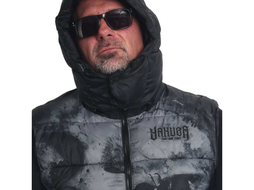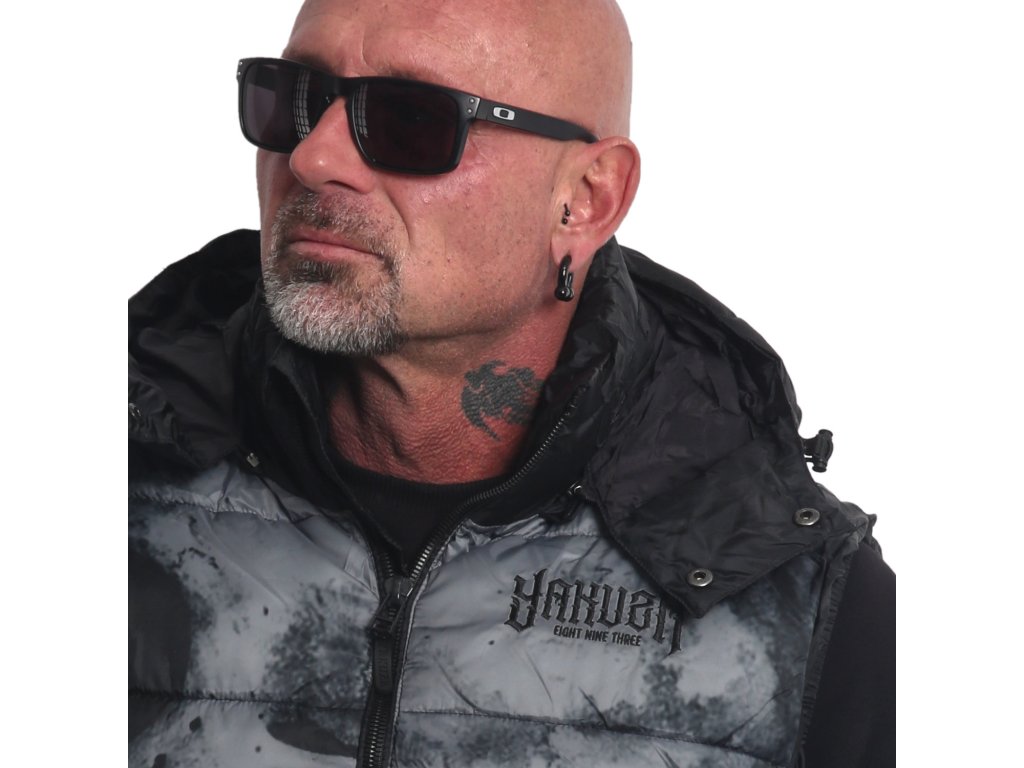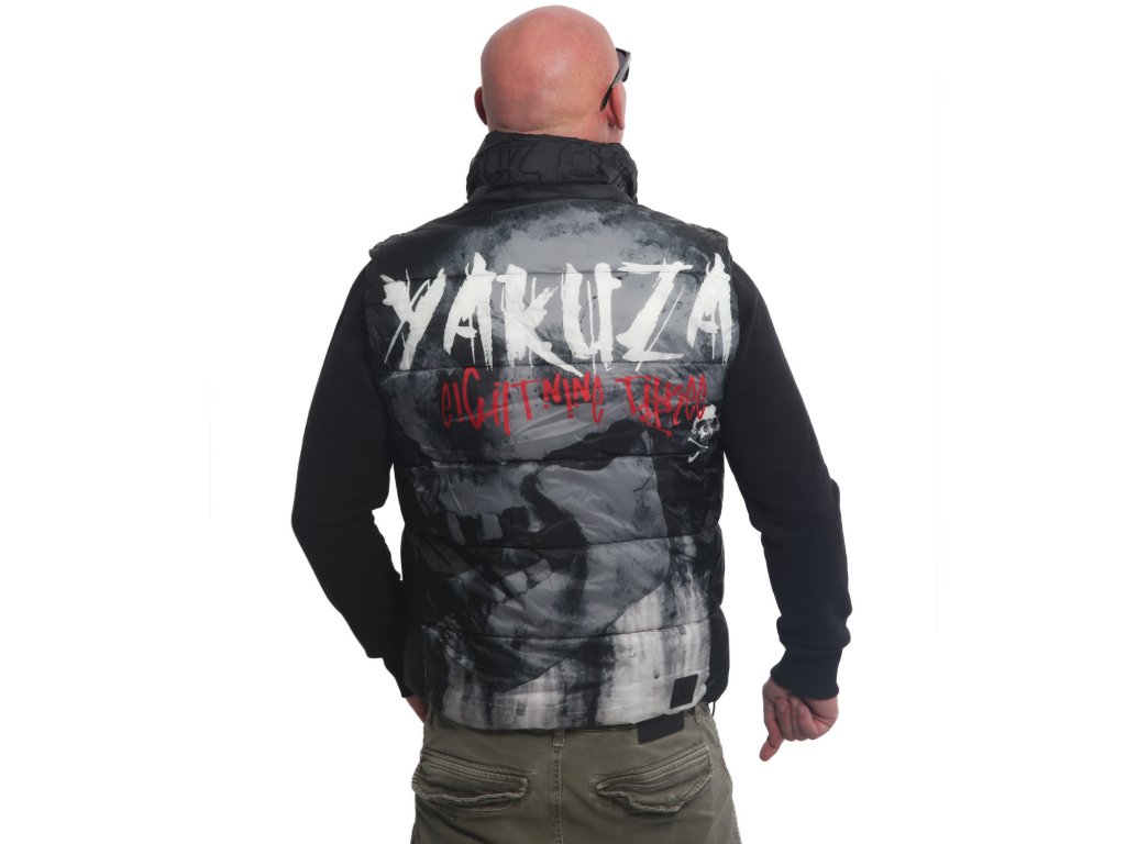 Pánská vesta Yakuza Skull Tag Pusher 22072 v šedo-černém barevném provedení. Vesta má odepínací kapuci, dvě boční kapsy na zip a výšivku YAKUZA na límci a levé straně hrudi. Model je vysoký 1,82m a nosí velikost XL.